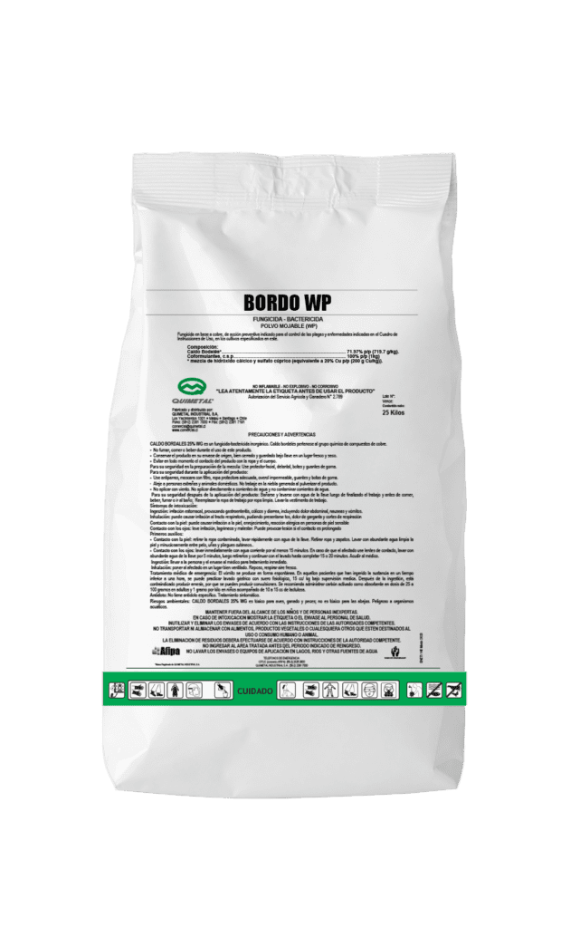 Bordo Wp es un fungicida bactericida en base a Sulfato Cuprocálcico. El Caldo Bórdales pertenece al grupo químico de los compuestos de cobre.